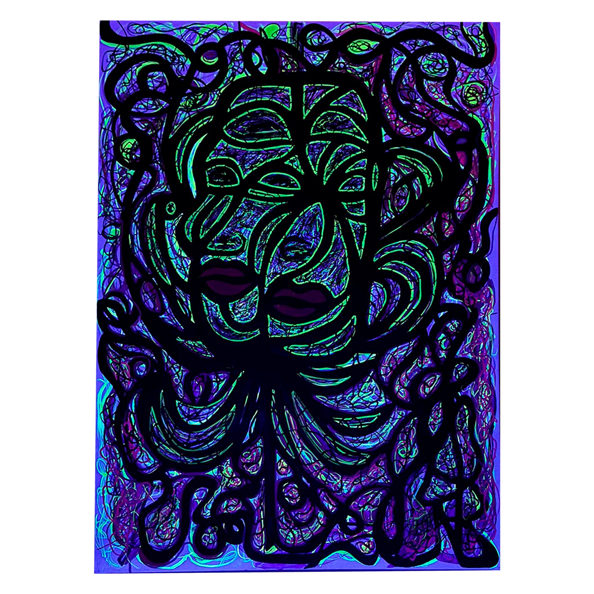 Il quadro "SPUN HEADS^", realizzato con pennarelli Uniposca e inchiostri UV, raffigura un intreccio viscerale di teste umane che si fondono, si sovrappongono e si confondono in un turbine visivo ipnotico. Le linee sono vibranti e caotiche, i colori fluo si rincorrono creando un movimento continuo, come se i pensieri, le identità e le emozioni dei soggetti fossero intrappolati in un loop psichedelico e incontrollabile.